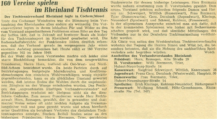 Am 16.Juli 1949 trafen sich in Trier die Funktionäre des Fachamtes Tischtennis zur Gründung eines eigenen Verbandes. Dies wurde einstimmig beschlossen. Präsident des neuen Verbandes wurde Willi Biermann. Der Verband wurde in vier Bezirke eingeteilt: Trier, Koblenz, Westerwald und Bad Kreuznach.