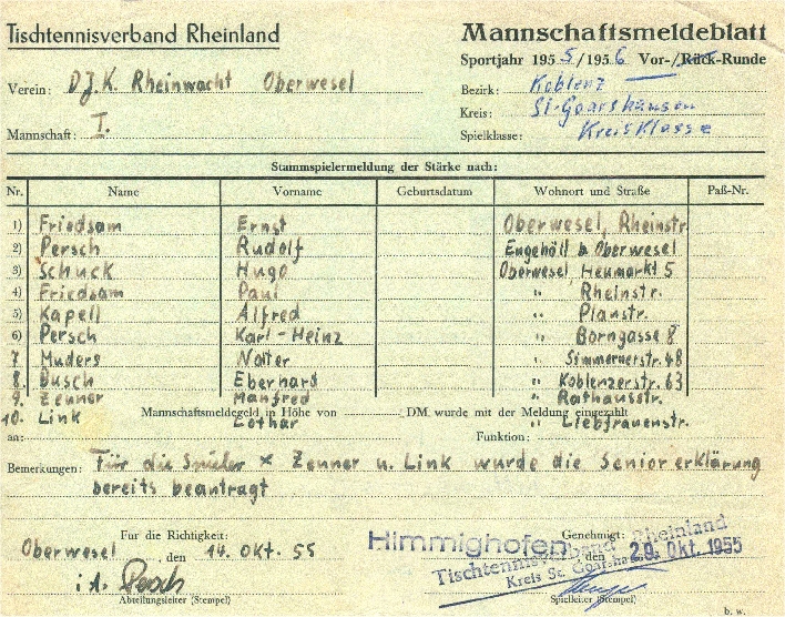 Zwei Monate später hat Hugo Schuck die Pässe (DM 1,- für Senioren und DM -,50 für Jugendliche) für die Stammspieler sowie die Reservisten Edgar Dittmayer, Heinz Groen, Karl-Heinz Persch, Rudolf Persch, Manfred Zeuner und Lother Link vorliegen. Die Gegner der DJK kommen aus Kaub, Oberlahnstein, Himmighofen, Lautert/Taunus, Nastätten, St.Goarshausen, Bacharach und Emmelshausen.