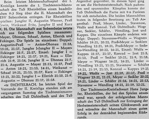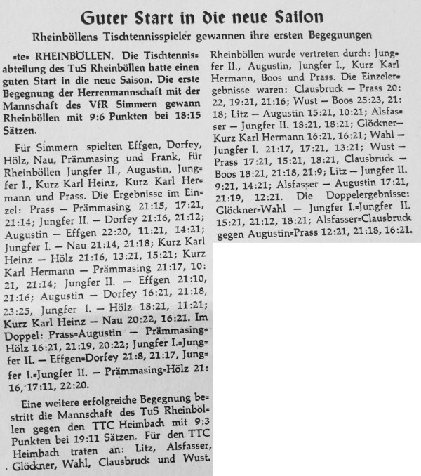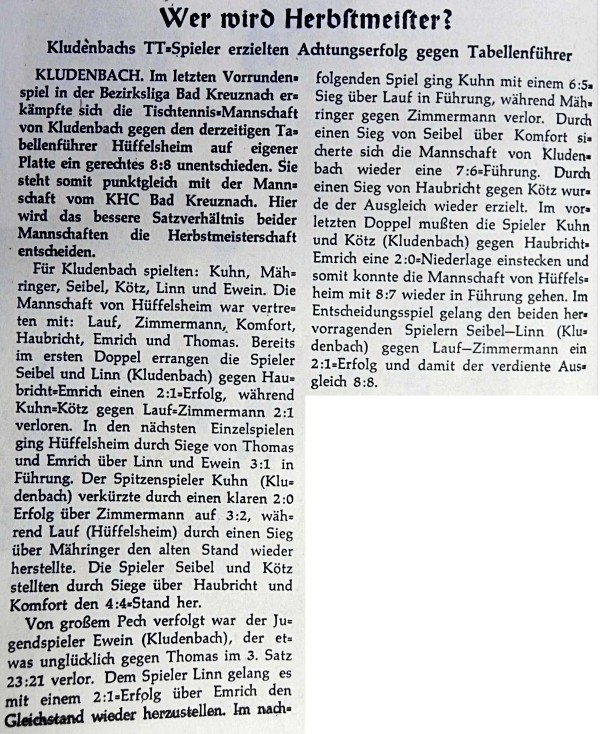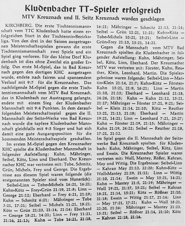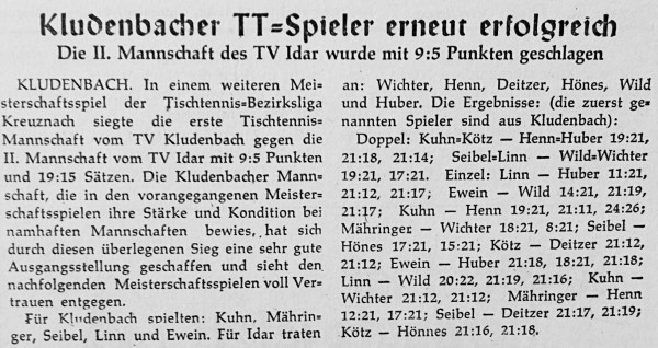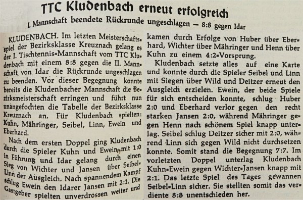 In der Bezirksliga Kreuznach (manchmal auch Bezirksklasse genannt) wurde der TTC Kludenbach mit 5 Punkten Vorsprung Meister vor dem Kreuznacher HC und errang damit den Bezirksmeistertitel. In der Klasse traten ursprünglich 9 Mannschaften an, die Spiele von Bretzenheim wurden jedoch annulliert.