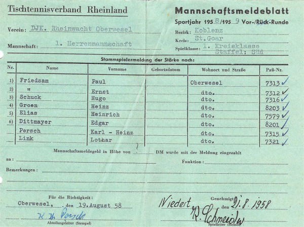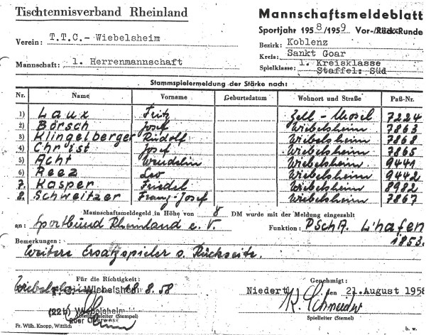 Neben dem bereits erwähnten Meister der Staffel Süd (Staffel 1) traten u.a. auch die Mannschaften von Oberwesel und Wiebelsheim an. Die Meldebogen liegen vor: