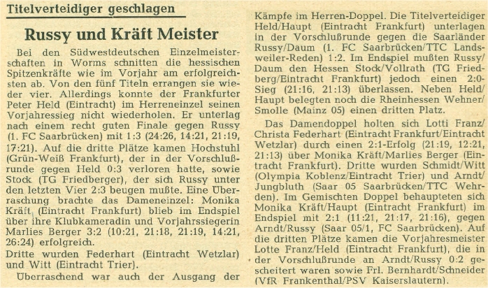 | 1. | Monika Kräft Werner Haupt | Eintracht Frankfurt Eintracht Frankfurt | HeTTV HeTTV |