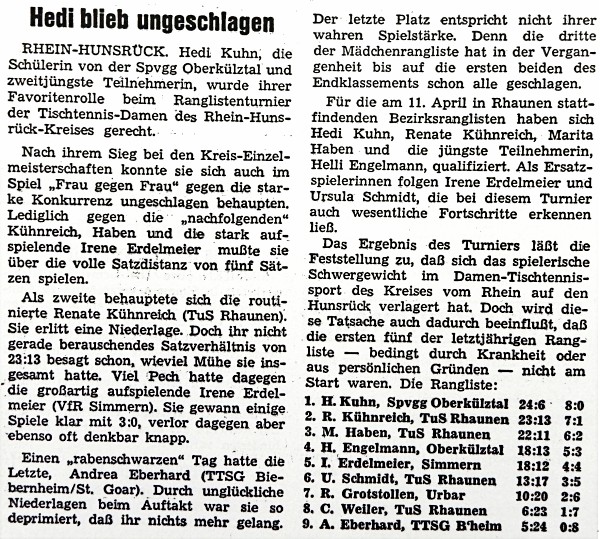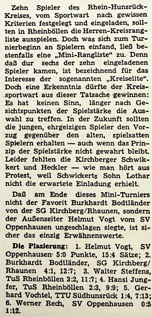 Die Kreisranglisten der Herren wurden am 11.April 1976 in Rheinböllen und die der Damen am 21.3.1976 in St.Goar ausgetragen. Helmut Vogt von der SV Eintracht Oppenhausen und Hedi Kuhn von der SpVgg Oberkülztal konnten sich in die Siegerlisten eintragen.