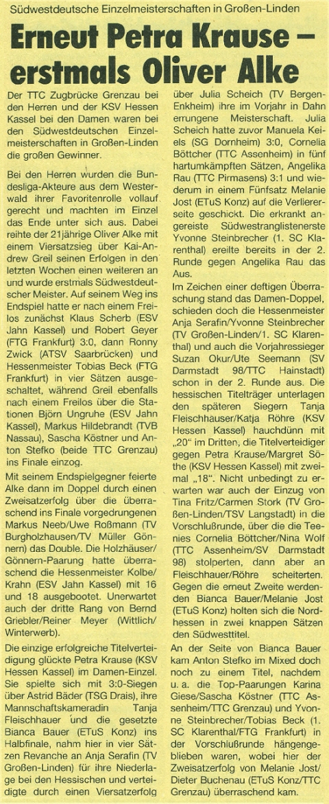 | 3. | Tanja Krämer (Hain-Hofmann) Melanie Textor | TTC Mörfelden TTC Grün-Weiß Staffel | HeTTV HeTTV |
