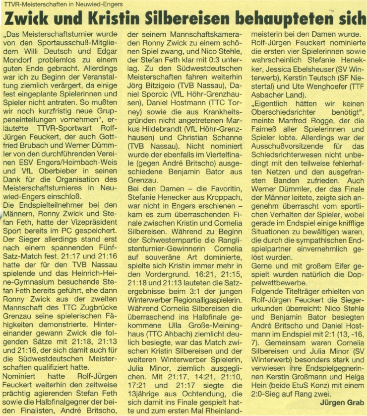 | 1. | Kristin Lang (Silbereisen) Anke Sessenhausen | SV Winterwerb TTF Asbacher Land | |
