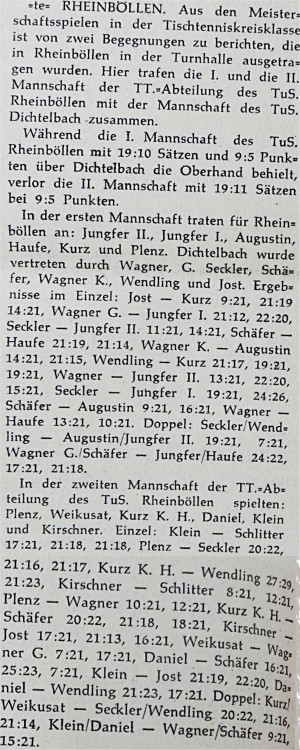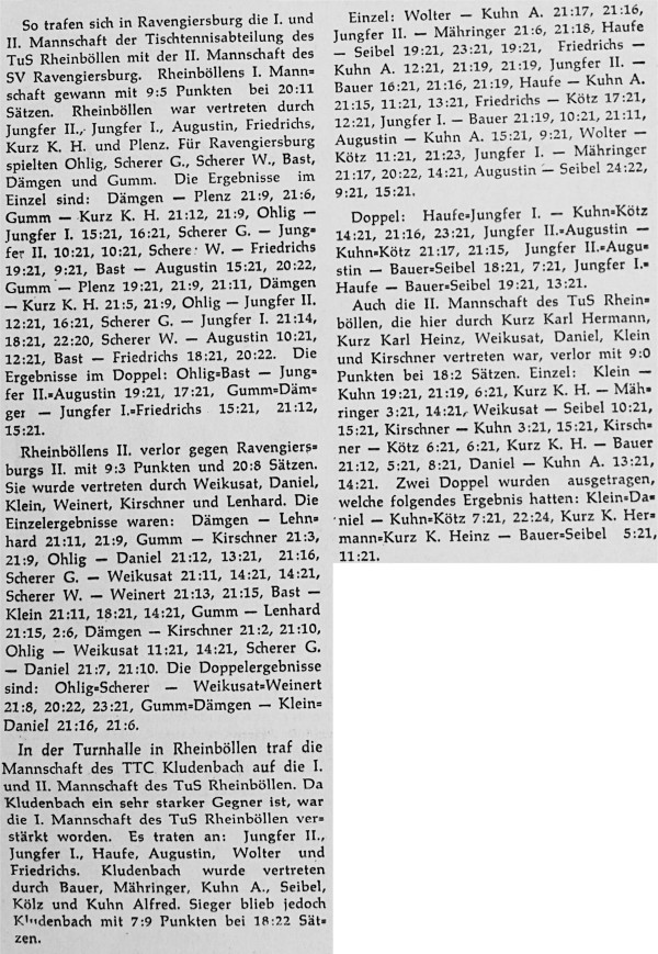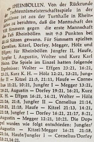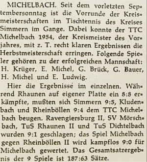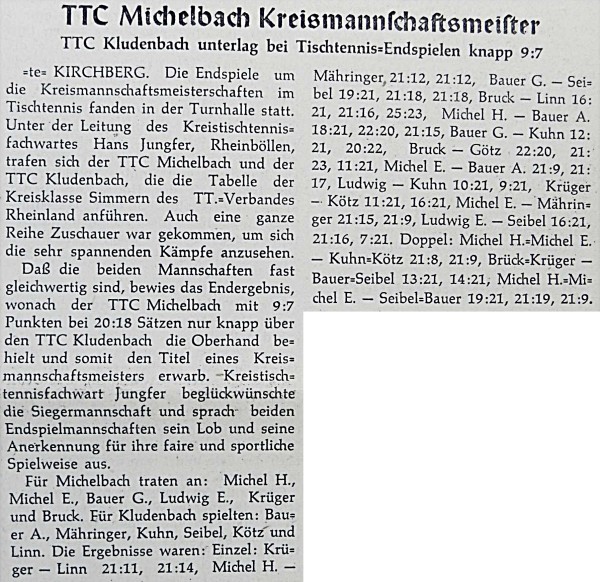 Auf Kreisebene wurden die beiden Staffeln des Vorjahres zu einer Klasse zusammengelegt. Gespielt wurde mit 10 Mannschaften. Am Ende der Saison waren der TTC Michelbach und der TTC Kludenbach punktgleich und trugen ein Entscheidungsspiel um die Kreismannschaftsmeisterschaft aus. Der TTC Michelbach konnte denkbar knapp mit 9:7 den Titel erringen.