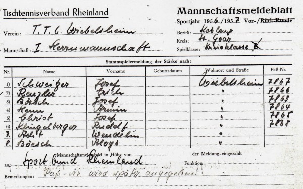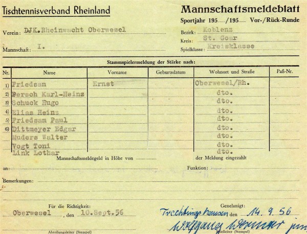 Sowohl von der DJK Oberwesel als auch vom TTC Wiebelsheim liegen die Meldeblätter der Saison vor: