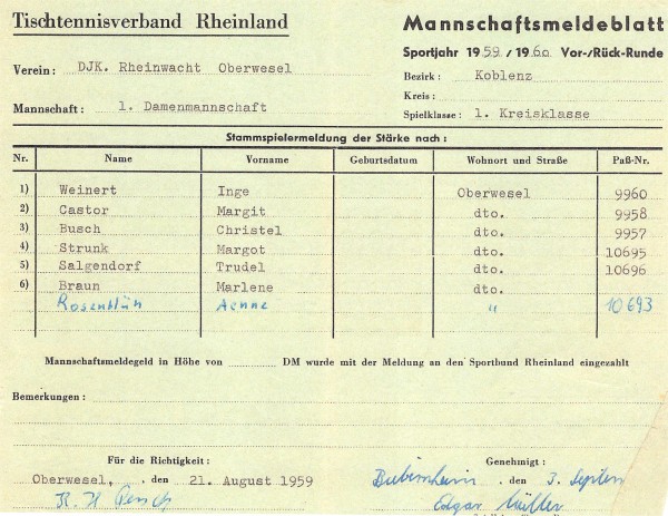 Die Tabelle liegt nicht vor, aber das Meldeblatt der Oberweseler Damenmannschaft: