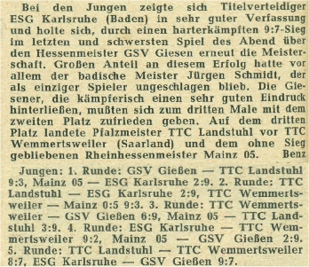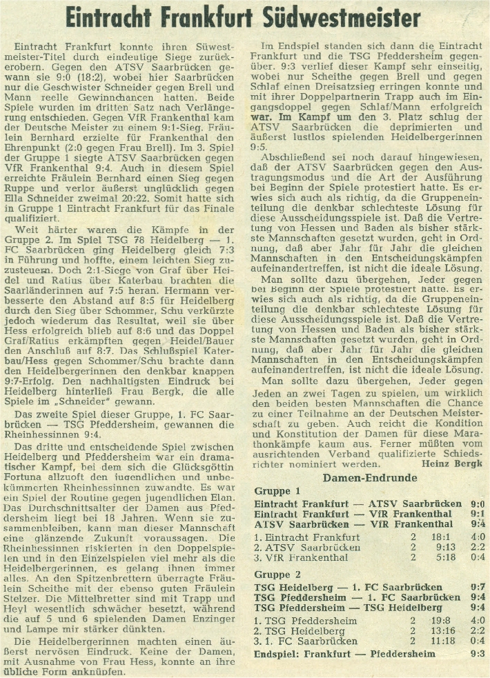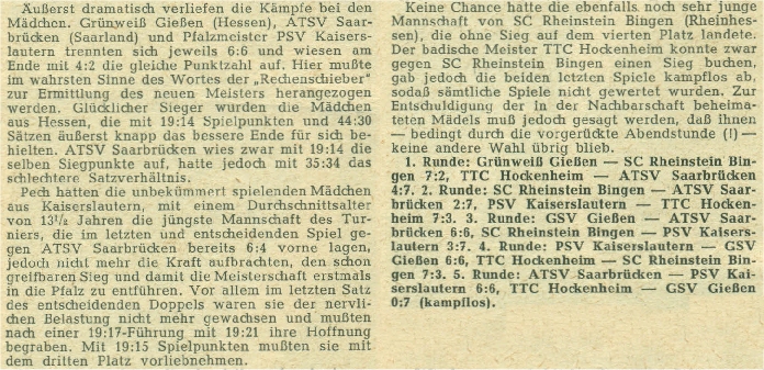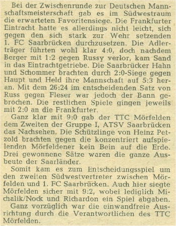 Im Qualifikationsturnier zur Teilnahme an den Deutschen Meisterschaften setzten sich mit Eintracht Frankfurt und dem TTC Mörfelden die hessischen Mannschaften durch.