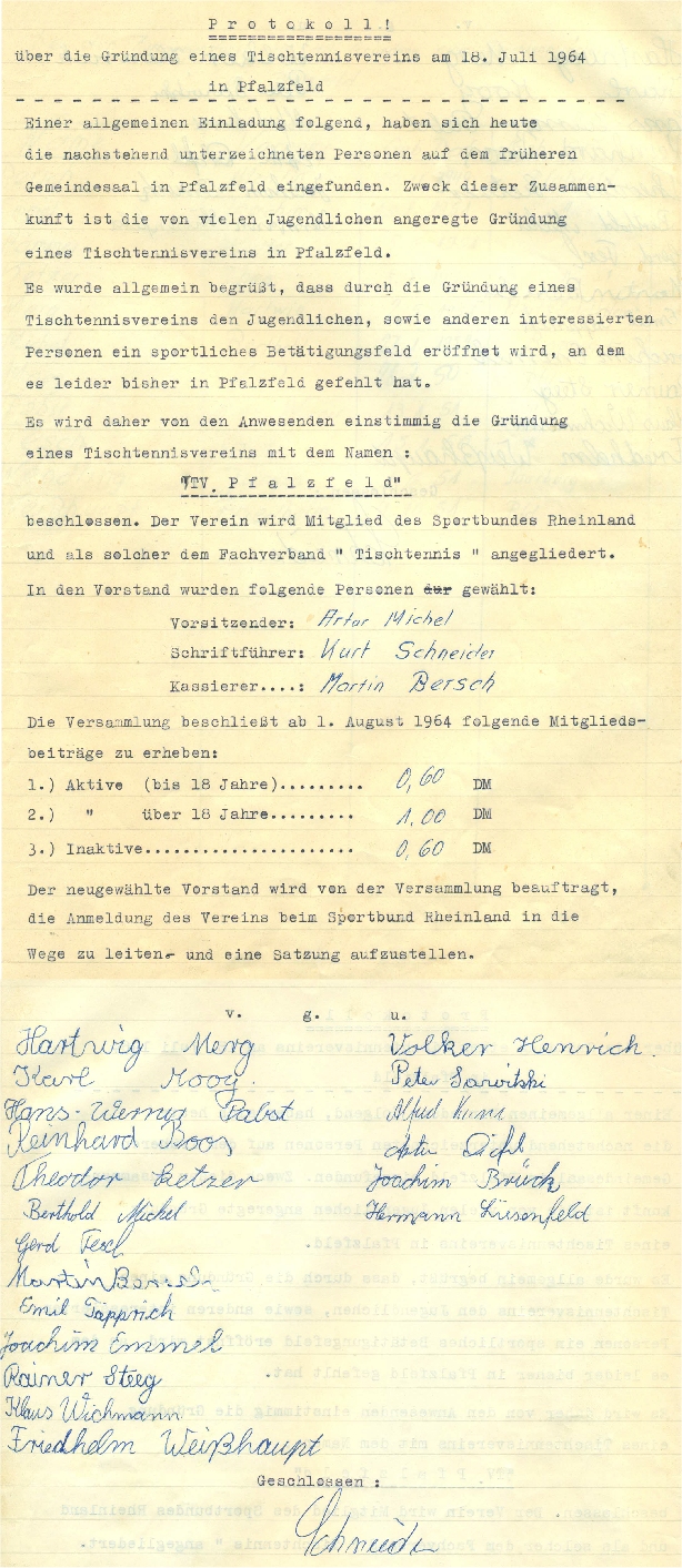 Das Gründungsprotokoll des TTV Pfalzfeld liegt vor: