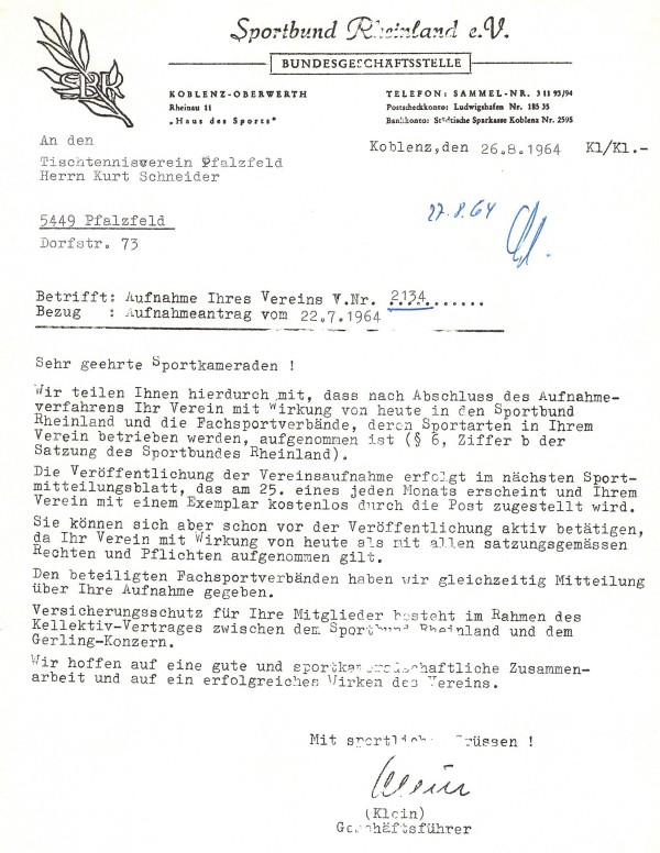 Am 26.August 1964 wird der TTV Pfalzfeld in den Sportbund Rheinland aufgenommen: