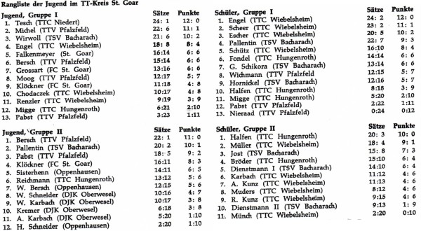 Die Jugend- und Schülerranglisten sind in einer Übersicht enthalten. Dazu sollte man wissen, dass bei Jugend und Schülern jeweils die Gruppe 2 zeitlich vorher ausgetragen wurde und die besten Spieler dieser Gruppe dann in der nächsten Turnier in der Gruppe 1 mitspielen durften.