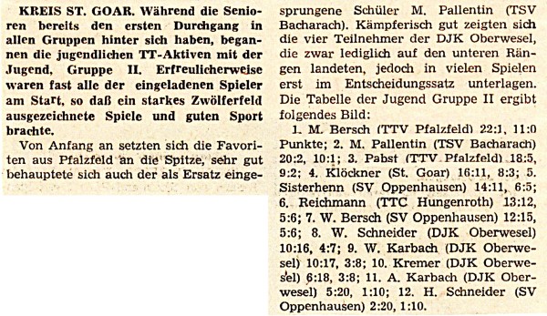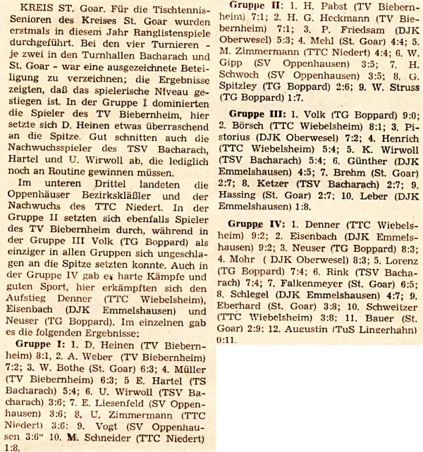 Erstmalig in dieser Saison wurden im Kreis St.Goar Kreisranglisten bei den Herren ausgetragen. Die ersten Qualifikationsturniere der Herren und auch der Jugend fanden im Januar 1967 in St. Goar statt.