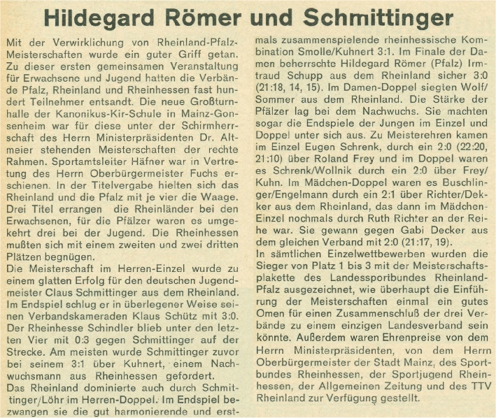 | 1. | Hannelore Dillenberger (Sommer) Rita Wolf | TTC Olympia Koblenz VfL Höhr-Grenzhausen | TTVR TTVR |
