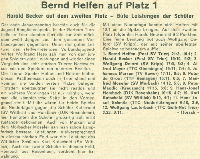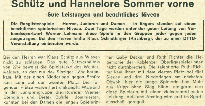 Anfang Januar wurden in Engers die Verbandsranglisten von Herren, Damen und Junioren ausgetragen. Klaus Schmittinger war zu einer Veranstaltung des DTTB geladen und konnte nicht teilnehmen. Klaus Schütz vom VfB Wissen und Hannelore Sommer (TTC Olympia Koblenz) konnten die Ranglisten jeweils ohne Niederlage für sich entscheiden.