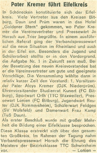 1970/71 wurde im Rahmen der Umstrukturierung im TTVR der Bereich Eifel ins Leben gerufen. Die bisherigen Kreise Bitburg, Daun und Prüm wurden zusammengelegt. Die konstituierende Sitzung fand Mitte 1970 statt: