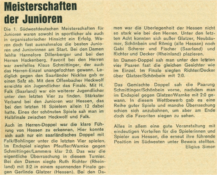 | 1. | Christa Rühl (Federhart) Günter Köcher | Gießener SV Eintracht Frankfurt | HeTTV HeTTV |