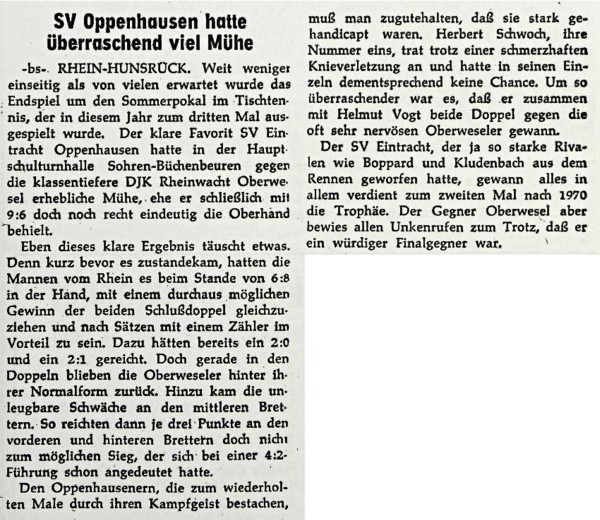 Schlagzeilen machte erneut der Sommerpokal. Hier der Bericht vom Endspiel in der Hunsrücker Zeitung am 1.August 1972: