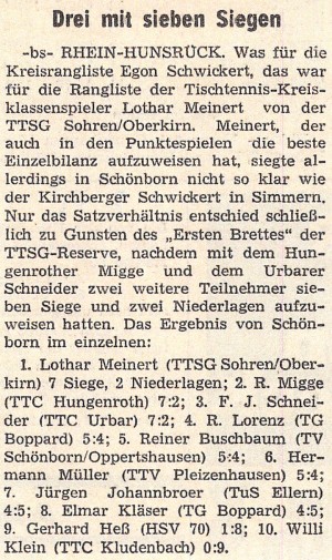 In der Kreisklassenrangliste waren gleich 3 Spieler mit 7:2 Siegen spielgleich, sodass hier das Satzverhältnis entscheiden musste: Lothar Meinert von der TTSG Sohren/Oberkirn siegte vor Reinhard Migge (TTC Hungenroth) und Ernst-Josef Schneider (TTC Urbar).