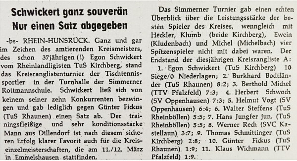Wie im Vorjahr konnte Egon Schwickert die Kreisrangliste ohne Niederlage für sich entscheiden. Burkhard Bodtländer (TuS Rhaunen) und Berthold Michel (TTV Pfalzfeld) folgten auf den Plätzen zwei und drei.
