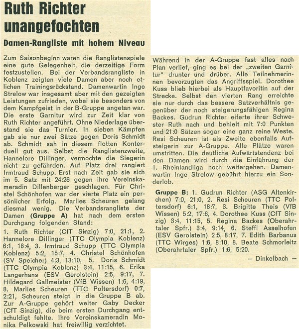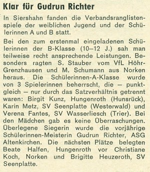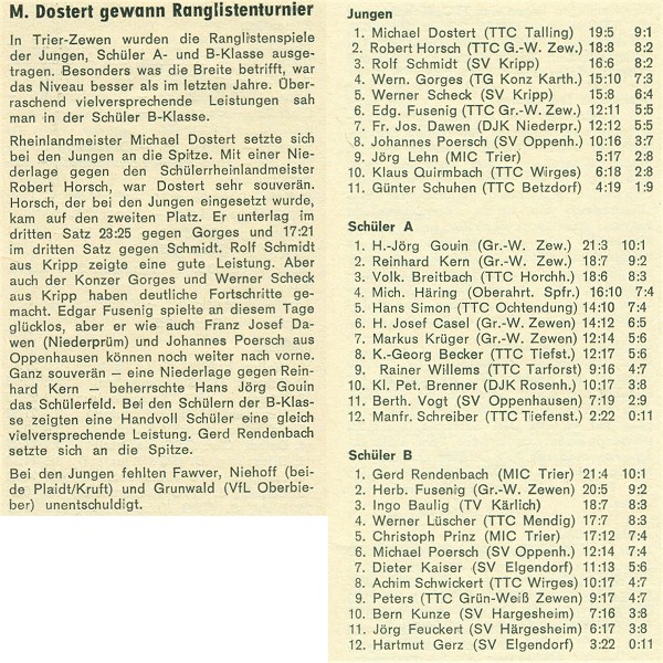 Im September 1972 wurden in Trier-Zewen die Verbandsranglisten der männlichen Nachwuchsklassen ausgespielt. Mit Johannes Pörsch (8.Platz, Jungen), Berthold Vogt (11.Platz, Schüler A) und Michael Pörsch (6.Platz, Schüler B) konnten sich 3 Oppenhauser Nachwuchstalente in der Rangliste platzieren.