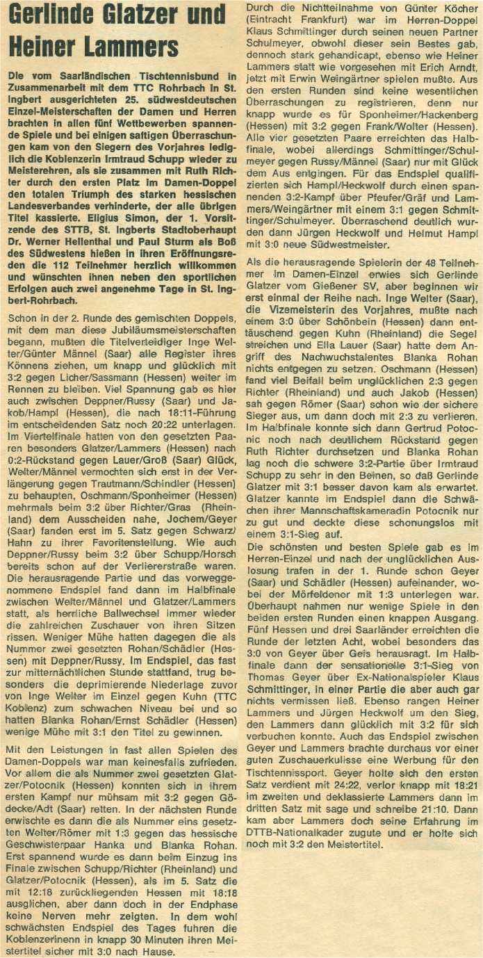 | 1. | Anke Schreiber (Olschewski) Cornelia Frieser | TTC Grün-Weiß Staffel SC Klarenthal | HeTTV HeTTV |
