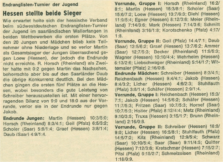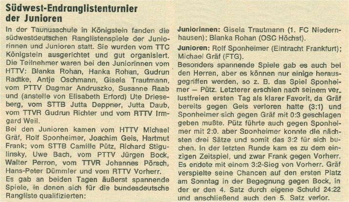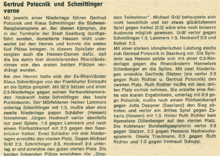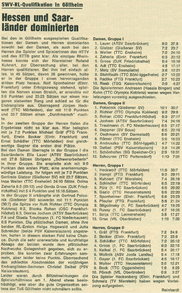 Während bei den Herren kein Spieler des TTVR teilnahm, konnten sich im Damenbereich wieder 3 Koblenzer Spielerinnen in Szene setzen: Ruth Richter wurde Dritte und Hannelore Dillenberger Vierter. Irmtraud Schupp belegte den 8.Platz.