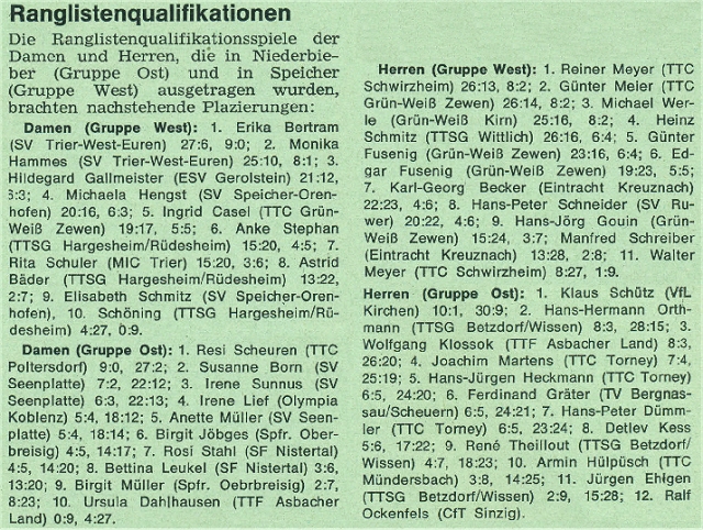 | Bei den Herren und Damen wird hier die offizielle Rangliste vom Saisonende ausgegeben, da es bei den im September 1981 in Selters ausgetragenenen Ranglisten Unregelmäßigkeiten gab (siehe DTS Regional Südwest 2/1982). |