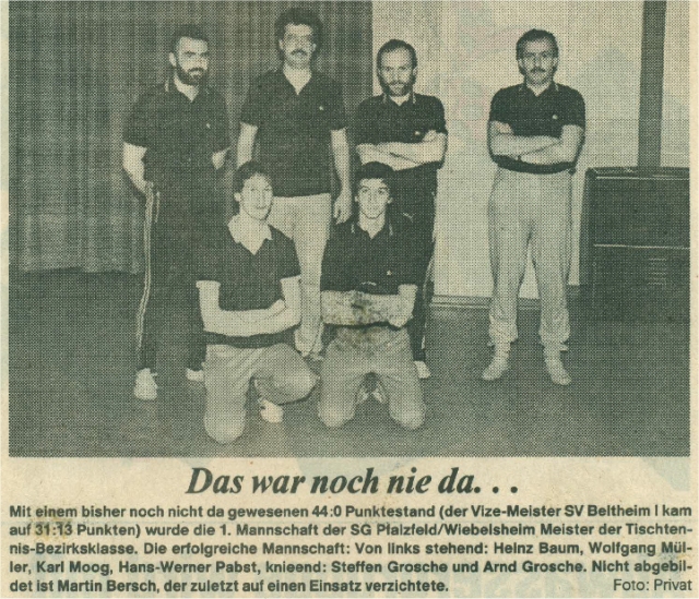 Kreismannschaftsmeister der Schülerinnen wurde der TV Biebernheim. Die Mannschaft trat in der Kreisklasse der Mädchen an und besiegte im Endspiel um die Schülerinnen-Mannschaftsmeisterschaft den TTC Reich mit 6:1. Nicole Stockter, Heike Roth und Eva Hoffmann spielten bei Biebernheim. Silke Bonn holte den Ehrenpunkt für Reich.