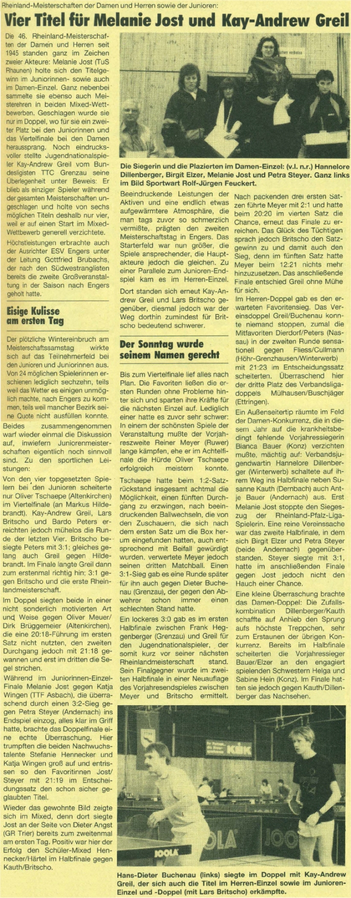 | 2. | Melanie Dreher (Jost) Petra Steyer | TuS Rhaunen TB Andernach | |