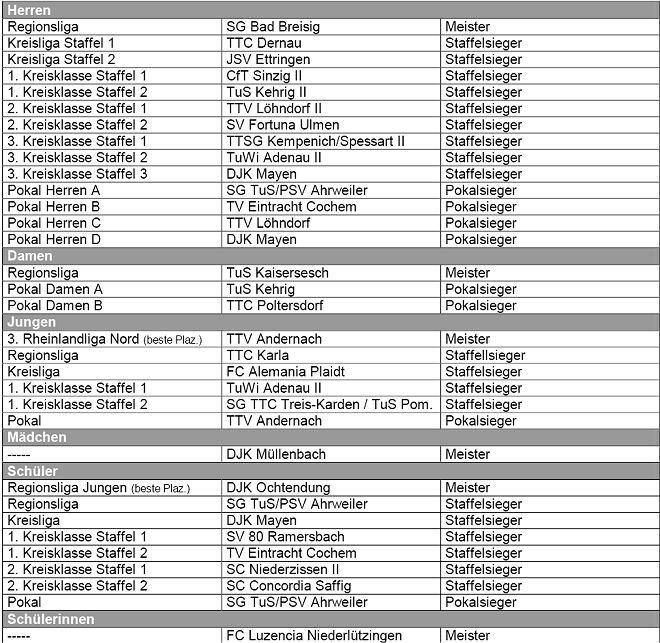 Übersicht über die Titelgewinner der Saison im Mannschaftsspielbetrieb