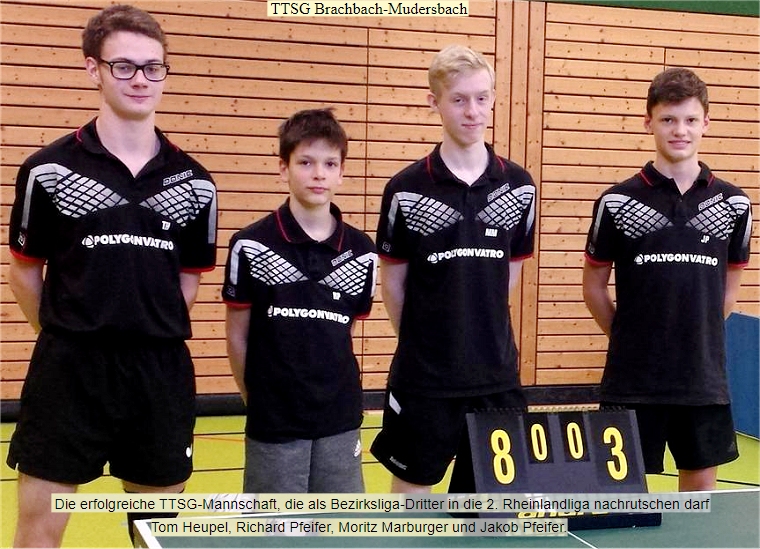 | Am 12.5.2018 trafen sich in Wirges sechs Mannschaften und spielten im System Jeder-gegen-Jeden die Meisterschaft aus. Im entscheidenden Spiel um die Meisterschaft trafen der TTC Ockenfels und der TTC Wirges aufeinander. Den 3.Platz belegte die Mannschaft von der TTG Kalenborn/Altenahr mit Gabriel Nelles, Marius Lüdiger, Lena Graf und Noah van Stetten. Auf dem 4. und 5.Platz folgten mit der gleichen Anzahl von 2 gewonnen Spielen aber schlechterem Spielverhältnis die Mannschaften vom TuS Mandel und der TTG Höchstenbach/Mündersbach. Der TuS Sohren belegt den 6.Platz. | |||