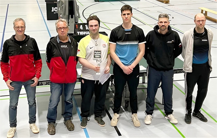 (v.l.: Pokalspielleiter Martin Morschhäuser, Julio Perez Rua, Arvid Kammann, Tobias Henrich, Kreisvorsitzender Jürgen Johann)