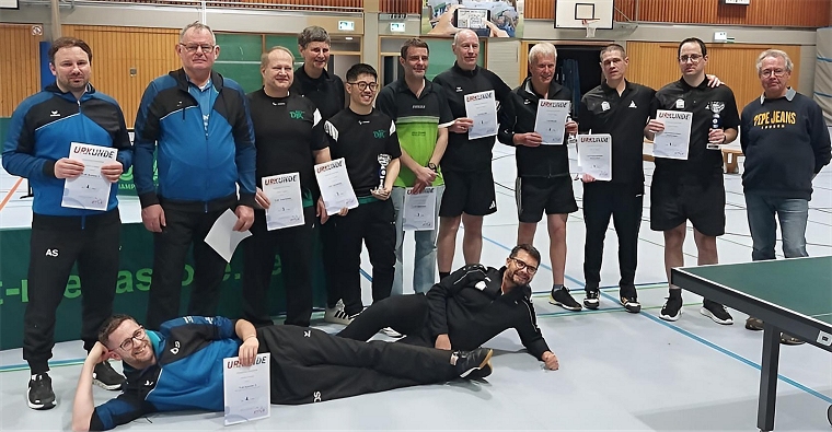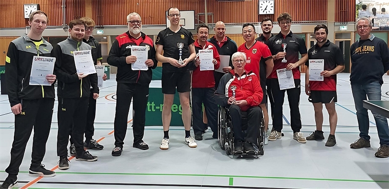 (stehend v.l. Artem Sagel, Alexander Sander, Georg Lunkenheimer, Herbert Goldschmidt, Victor Lam, Peter Schuck, Andreas Feit, Elmar Bremm, Dennis Böckler, Alexander Heimer, Kreisvorsitzender Jürgen Johann