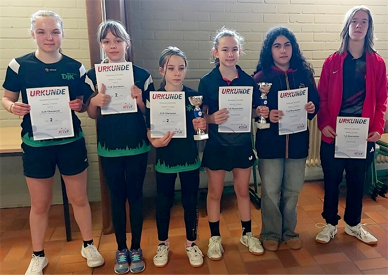 Die Endspielgegner Mädchen 15: Diana Deckert, Nicole Yakuta, Jula Schumacher (Oberwesel), Tessa Mettler, Daliya Zahid, Elisa Paul (Rheinböllen)